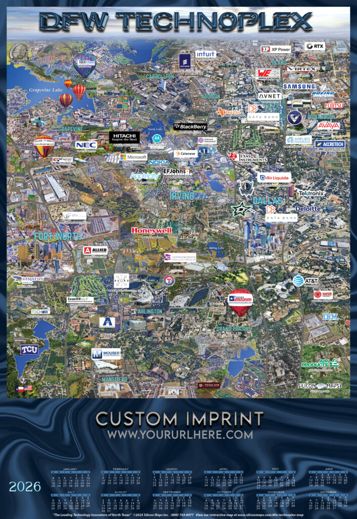 The iconic DFW TECHNOPLEX Map & Calendar is printed on thousands of posters and promotional pieces (mouse pads, greeting cards, postcards) annually and distributed to key industry professionals globally, at all levels, through major industry events, direct mail, and by participating companies. The compelling industry map is proudly displayed in executive offices, conference rooms, reception areas, work areas and considered an industry favorite for corporate gifts and trade events. Each map is viewed many times throughout the year!