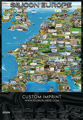 The iconic Silicon Europe Map & Calendar is printed on thousands of posters and promotional pieces (mouse pads, greeting cards, postcards) annually and distributed to key industry professionals globally, at all levels, through major industry events, direct mail, and by participating companies. The compelling industry map is proudly displayed in executive offices, conference rooms, reception areas, work areas and considered an industry favorite for corporate gifts and trade events. Each map is viewed many times throughout the year!