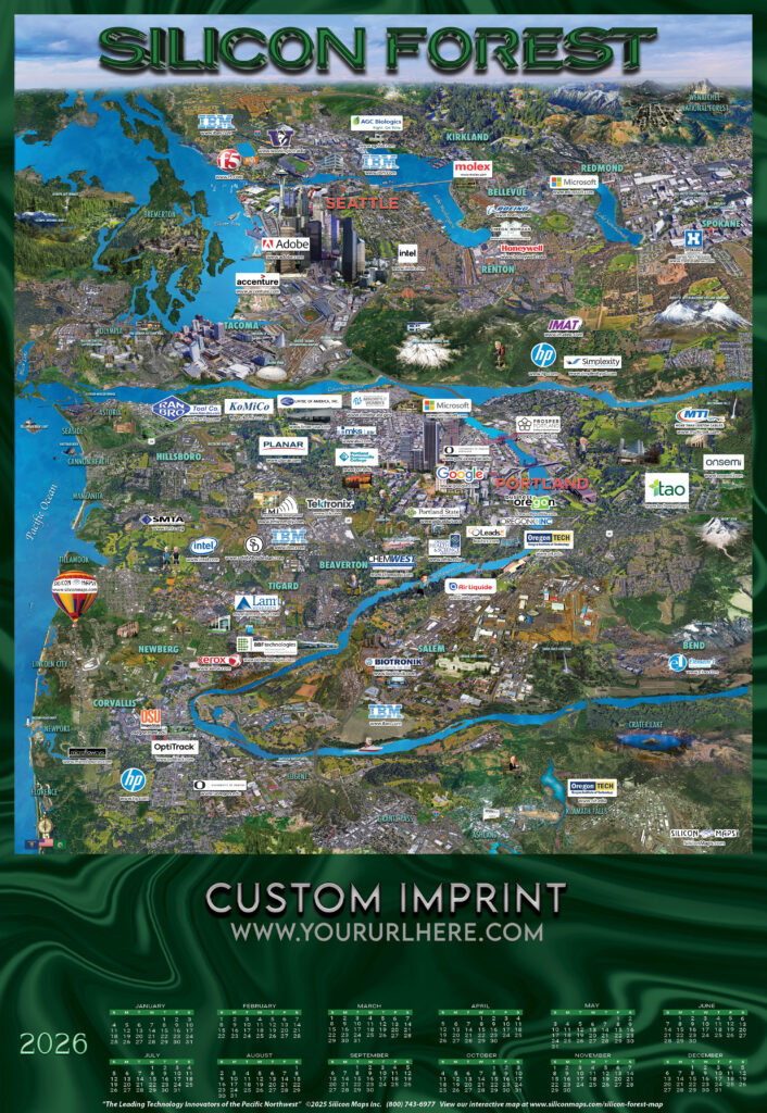 The iconic Silicon Forest Map & Calendar is printed on thousands of posters and promotional pieces (mouse pads, greeting cards, postcards) annually and distributed to key industry professionals globally, at all levels, through major industry events, direct mail, and by participating companies. The compelling industry map is proudly displayed in executive offices, conference rooms, reception areas, work areas and considered an industry favorite for corporate gifts and trade events. Each map is viewed many times throughout the year!