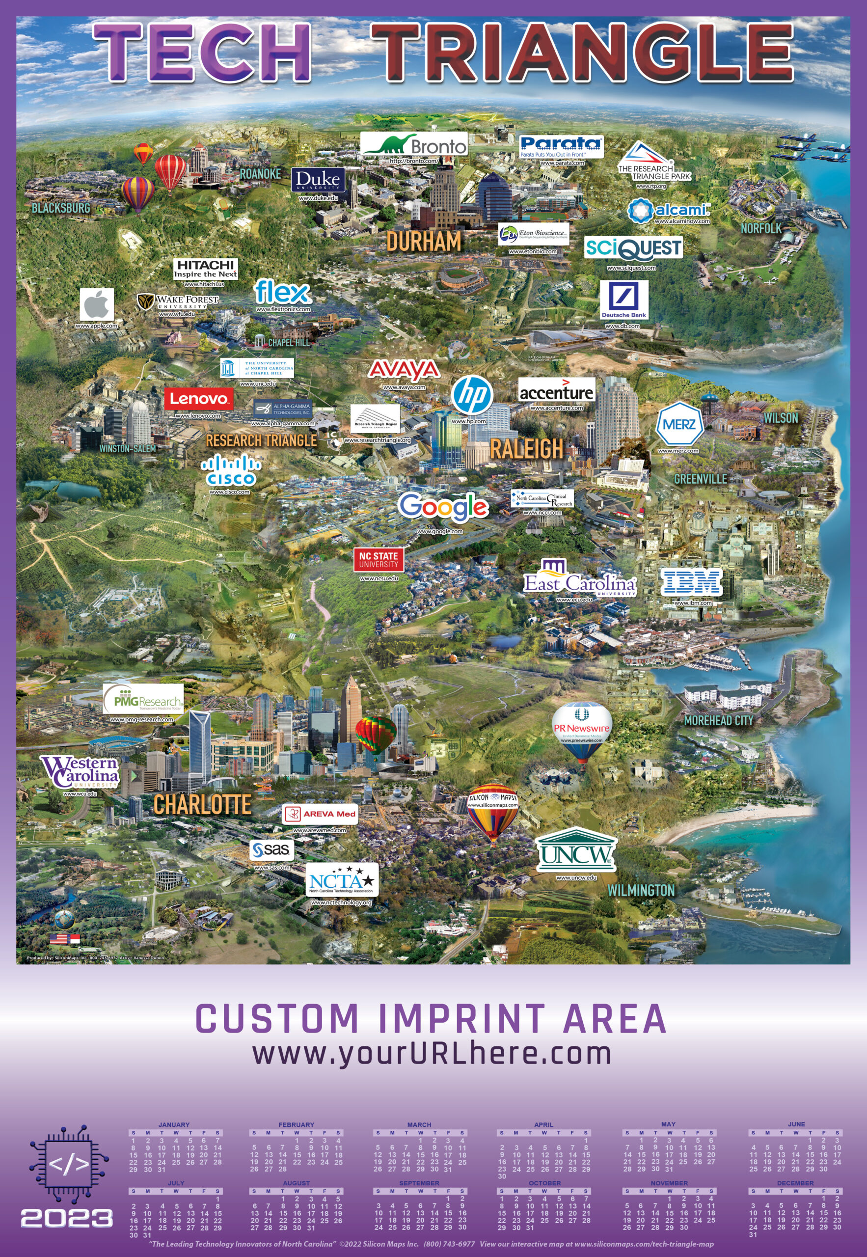 The Tech Triangle Map is the symbol of Technology Innovation in North Carolina. The yearly publication highlights technology, business and regional leadership with a visual engaging promotional poster. The popular poster is distributed at Industry Trade Events, shipped direct to thousands of industry executives, and promoted globally through Press Releases and our Interactive Web Map.
